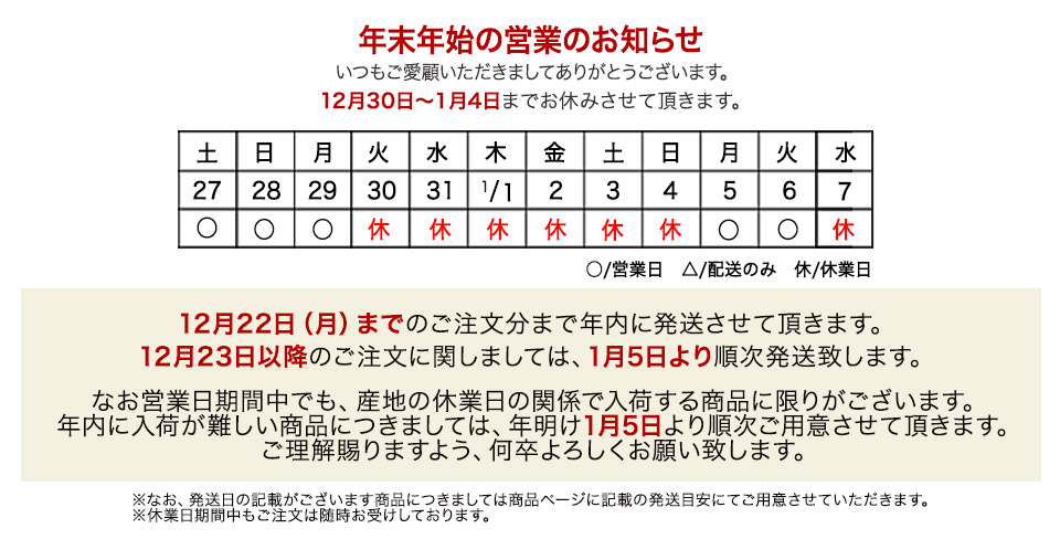- 大雪、地震、土砂災害、フェリーの運航状況によるお届けの遅延状況が各地で発生しております。何卒ご理解賜りますようお願い申し上げます。