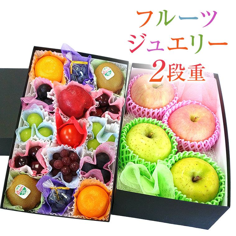 季節のギフト!大切な人へのプレゼント!色とりどりのフル-ツを一つ一つ丁寧に詰め合わせて、まるで宝石箱!可愛くて!誕生日やお祝いに最高のプレゼント!プロにお任せギフト! 果物ギフト 食の宝石箱 【フル-ツジュエリーBOX15個入と林檎4個入セット 2段重ね化粧箱入り】1段目はフルーツセット 2段目はおまかせ林檎セット※サンフジ・ジョナゴ-ルド・等 赤色りんご 王林・きおう・等 黄色りんごなど おまかせりんご4個入りです※