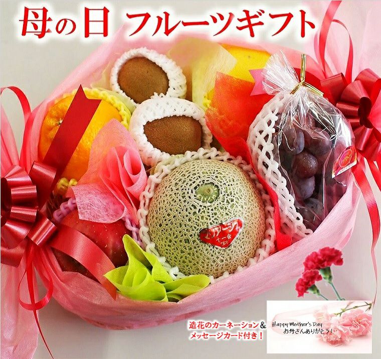 優しい風合いのラッピングが一押し! 母の日用造花カーネーション&メッセージカ-ド付 期間限定!母の日果物ギフト 食の宝石箱 【母の日バスケットメロン入り】フルーツ盛り籠 母の日ギフト 造花のカーネーションとメッセージカード付!