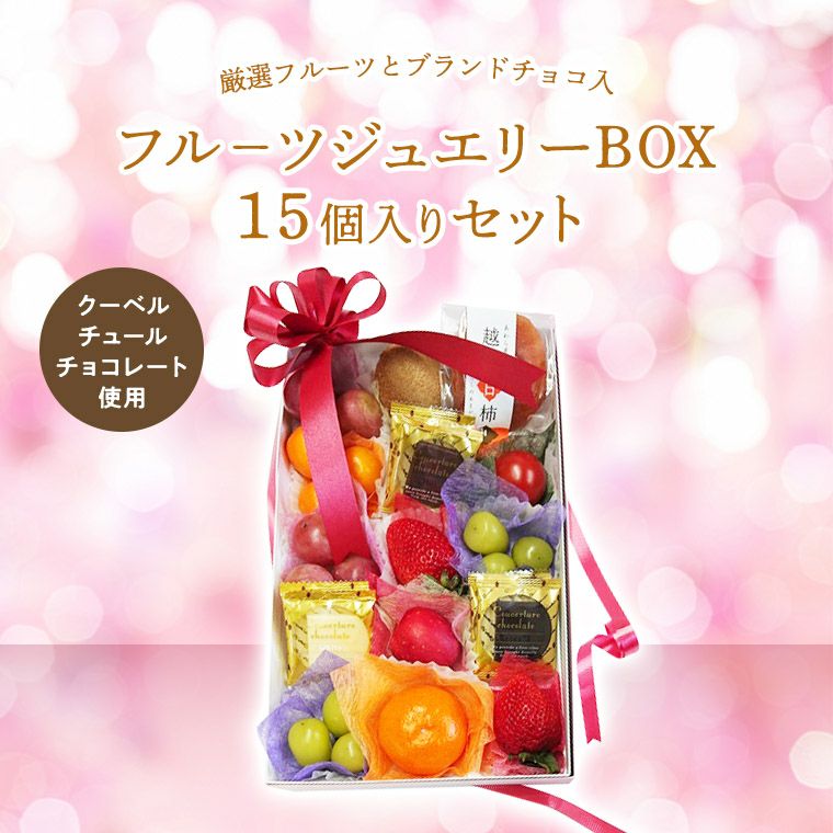 他の画像を見る 福井のブランドチョコ 横井チョコレート とのコラボ!色とりどりのフル-ツを一つ一つ丁寧に詰め合わせました!まるで宝石箱!可愛くて、大切な人への贈り物に!最高のプレゼント! 新!期間限定! 果物ギフト 食の宝石箱 【クーベルチュールチョコレート2~3種10枚入り フル-ツジュエリーBOX15個入セット化粧箱入り】 送料込み(一部除く) 10%オフ対象商品 クール便でお届け 当店特別価格 ¥ 6,480 税込 販売期間 2026/01/05 0:00 〜 2026/06/30 23:59 詳細を見る お気に入りに登録する