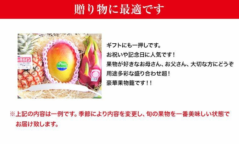 他の画像を見る お取り寄せ!南国フルーツギフト[スタッフ厳選]トロピカルフルーツ詰め合わせ 一押しギフト プレゼント 彩りフルーツ 期間限定!南国フルーツギフト 食の宝石箱【T】トロピカルフルーツ3種セット *パイン+アップルマンゴー+ドラゴンフルーツ等 おまかせで3種入ります* 送料込み(一部除く) クール便でお届け 当店特別価格 ¥ 4,930 税込 販売を終了しました。 詳細を見る お気に入りに登録する
