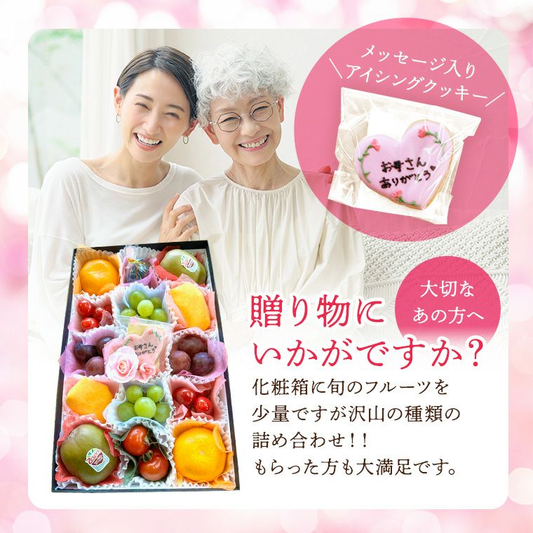 他の画像を見る 期間限定!手作りアイシングクッキー入り!色とりどりのフル-ツを一つ一つ丁寧に詰め合わせました!まるで宝石箱!可愛くて、大切な人への贈り物に!最高のプレゼント! 期間限定! 母の日ギフト 食の宝石箱 手作りアイシングクッキー入りフルーツジュエリーBOX15個入セット化粧箱入り *メッセージ入りアイシングクッキーと造花のカーネーション付き*今年の母の日ギフトは大盛況のうちに終了いたしました 送料込み(一部除く) 10%オフ対象商品 クール便でお届け 当店特別価格 ¥ 6,180 税込 販売を終了しました。 在庫切れ 詳細を見る お気に入りに登録する