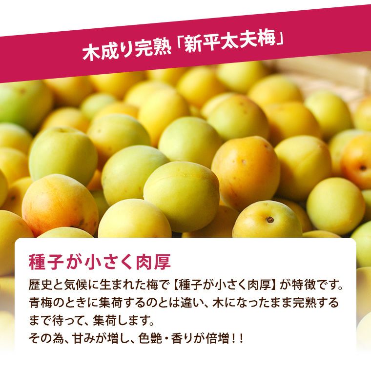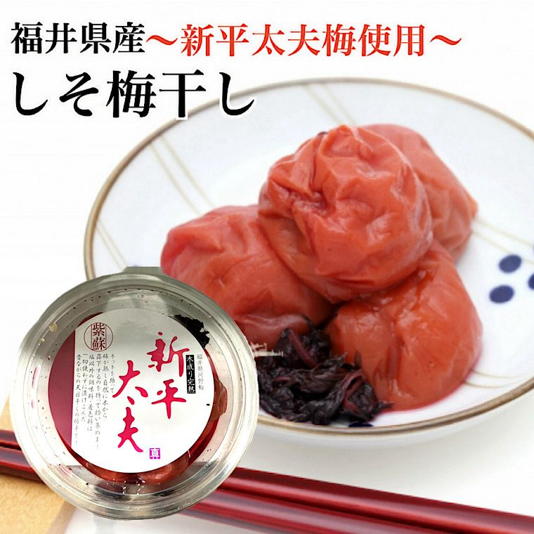 他の画像を見る 福井県のブランド梅【新平太夫梅】を天日干し!種が小さく果肉が厚い!紫蘇と塩のみで漬け込んだ昔ながらのすっぱい梅干しです。もちろん白米のおともに!おにぎりに!焼酎の梅干し割りにも! 福井県産【新平太夫梅しそ梅干し】約130g入りパック×3個セット 新平太夫梅使用 無添加 無着色 紫蘇 天日塩 塩分17-20% 送料込み(一部除く) 当店特別価格 ¥ 2,930 税込 詳細を見る お気に入りに登録する