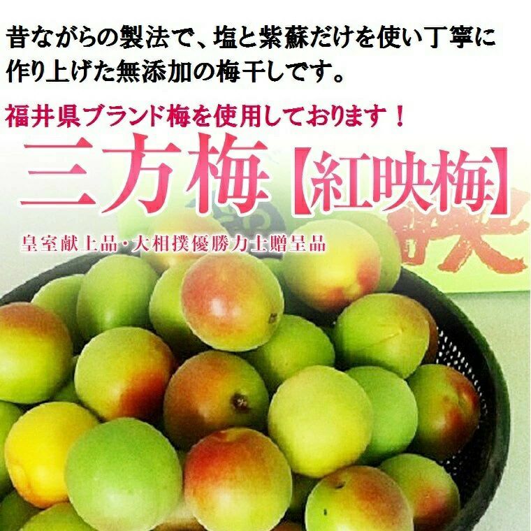 他の画像を見る 福井県のブランド梅【紅映梅】 種が小さく果肉が厚い!天日干しの後、紫蘇と塩のみで漬け込んだ昔ながらのすっぱい梅干しです。もちろん白米にも焼酎の梅干し割りにもどうぞ! 福井県産三方梅【しそ梅干し】秀品約220g入りパック×3個セット 紅さし梅使用 無添加 無着色 紫蘇 天日塩 送料込み(一部除く) 当店特別価格 ¥ 2,540 税込 詳細を見る お気に入りに登録する