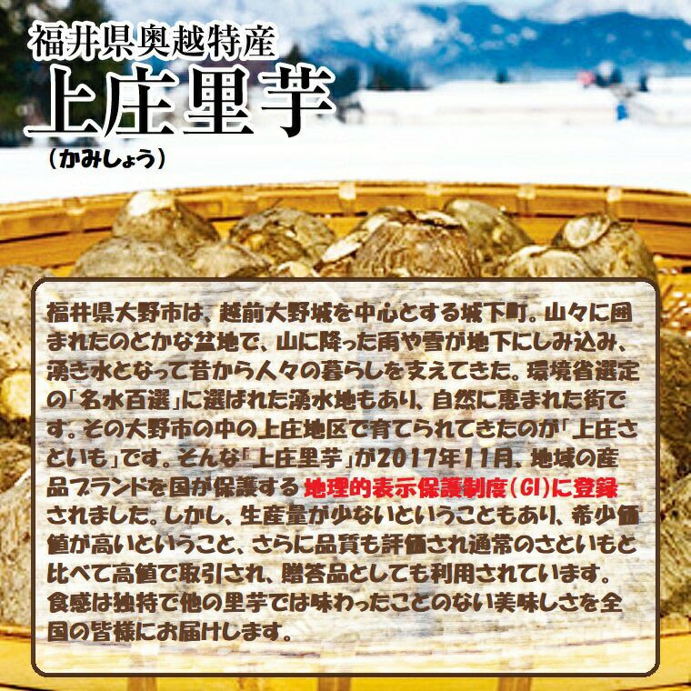 他の画像を見る 越前大野の清らかな水と澄んだ自然に囲まれて育った里芋です 福井県特産 上庄里芋 化粧箱入り【青秀】サイズ指定なし 10月下旬頃から順次発送予定 送料込み(一部除く) 一部10%オフ対象商品 当店特別価格 ¥ 3,180 税込 〜 当店特別価格 ¥ 税込 販売を終了しました。 詳細を見る お気に入りに登録する