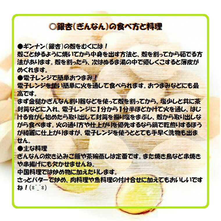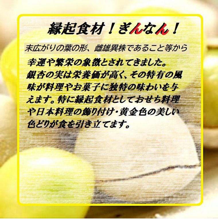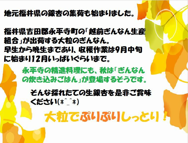 他の画像を見る 秋の味覚 季節の味 大粒で香り高い!茶碗蒸しに!焼いてそのまま食べても! 福井県永平寺特産 【銀杏】【生ぎんなん】大粒約100g入り×5パック 殻付きギンナン 送料込み(一部除く) 当店特別価格 ¥ 3,150 税込 販売期間 2025/10/14 0:00 〜 2026/02/28 23:59 詳細を見る お気に入りに登録する