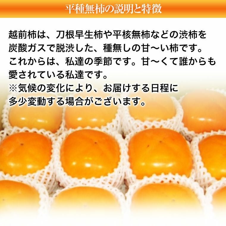 他の画像を見る 秋の果物の王様が登場!! 福井県産【越前柿】厳選大玉6玉化粧箱 ギフト用 種無し柿 平核無柿 送料込み(一部除く) 当店特別価格 ¥ 2,930 税込 販売を終了しました。 詳細を見る お気に入りに登録する