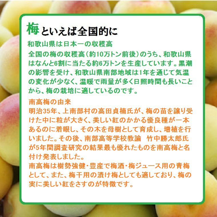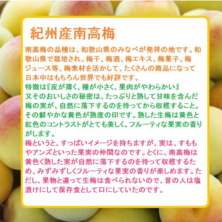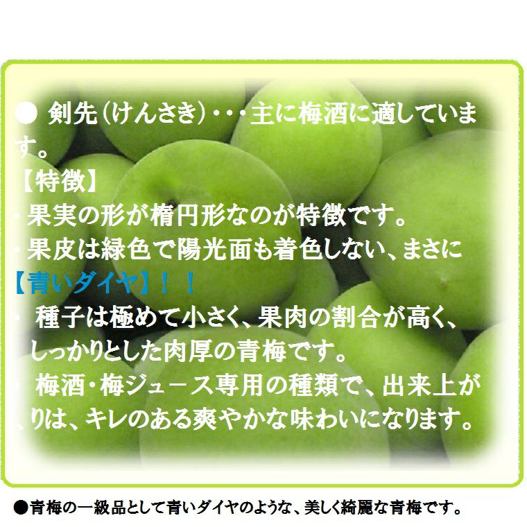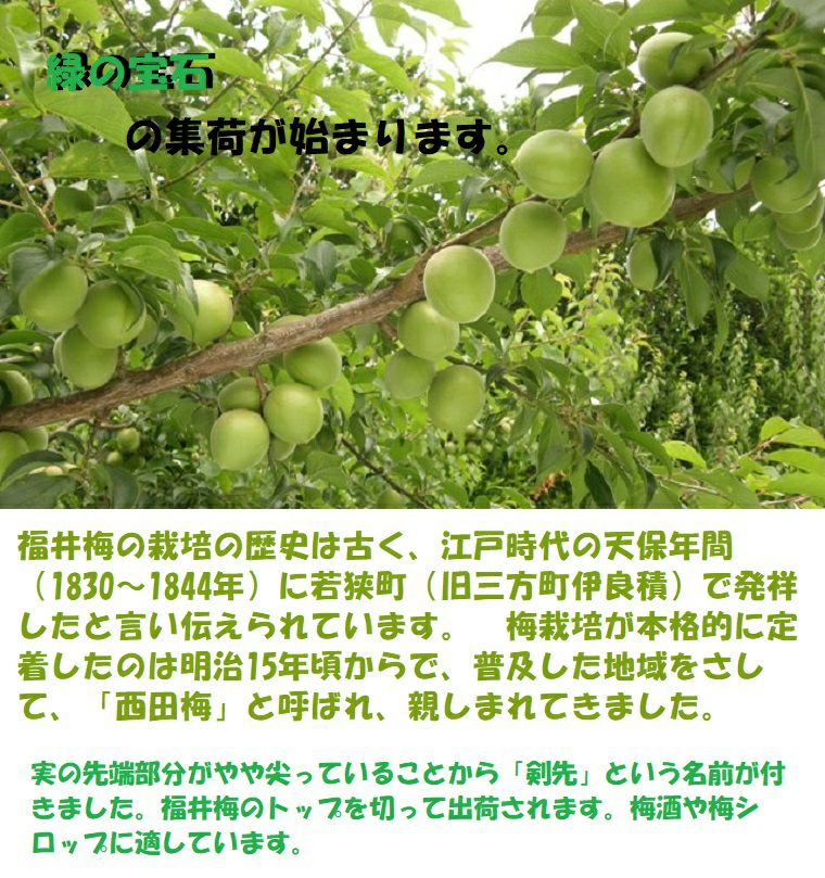 他の画像を見る 梅ジュース・梅酒のレシピ入りです。 福井梅は 果肉率が高く高品質【緑の宝石】梅酒用 梅干し用 梅シロップ用に最適です。 福井県三方梅【剣先】けんさき 秀品M~2Lサイズ 約5K箱 *6月初旬から順に発送予定 送料込み(一部除く) 10%オフ対象商品 クール便でお届け 当店特別価格 ¥ 10,890 税込 販売を終了しました。 在庫切れ 詳細を見る お気に入りに登録する