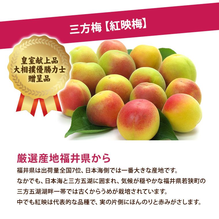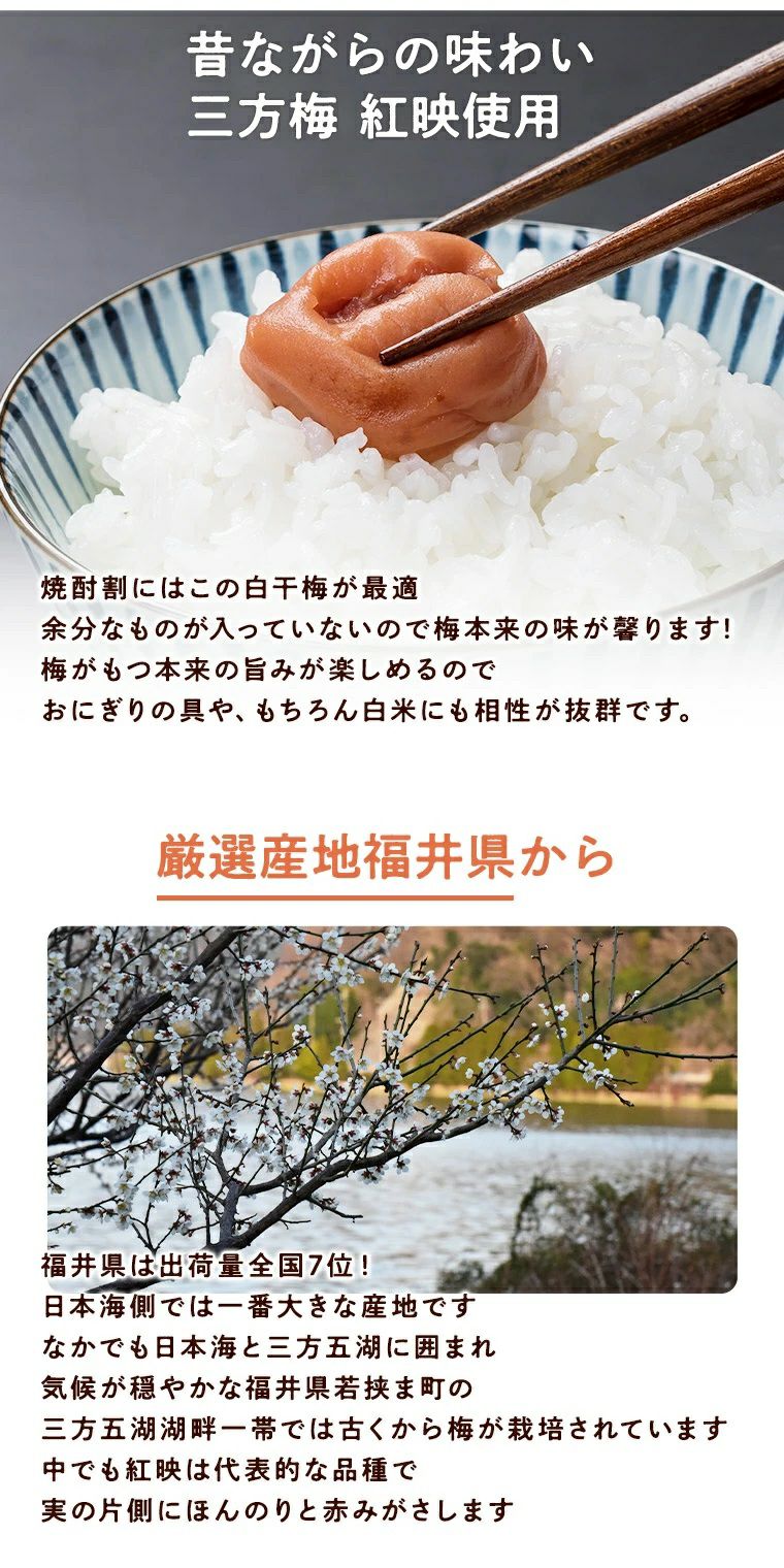 他の画像を見る 福井県のブランド梅【紅映梅】を天日干し しっとりで皮が薄く、塩のみで漬け込んだ昔ながらのすっぱい梅干しです。もちろん白米にも焼酎の梅干し割りにも 福井県産三方梅【白梅干し】秀品約500gパック入り 紅さし梅使用 無添加 無着色 天日塩 送料込み(一部除く) 当店特別価格 ¥ 1,830 税込 詳細を見る お気に入りに登録する