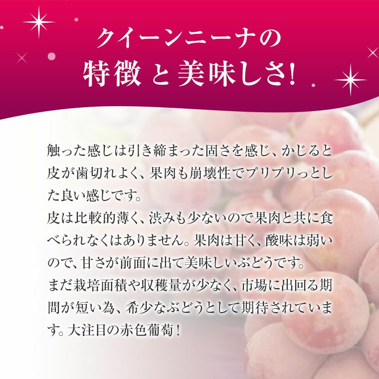 他の画像を見る 大注目の赤色ブドウ新品種!濃厚な甘味と豊かな香りは絶品♪ 国産大粒ぶどう【クイ-ンニ-ナ】大1房化粧箱 赤葡萄 山梨・長野県産 現在入荷不安定 送料込み(一部除く) クール便でお届け 当店特別価格 ¥ 4,100 税込 販売を終了しました。 在庫切れ 詳細を見る お気に入りに登録する