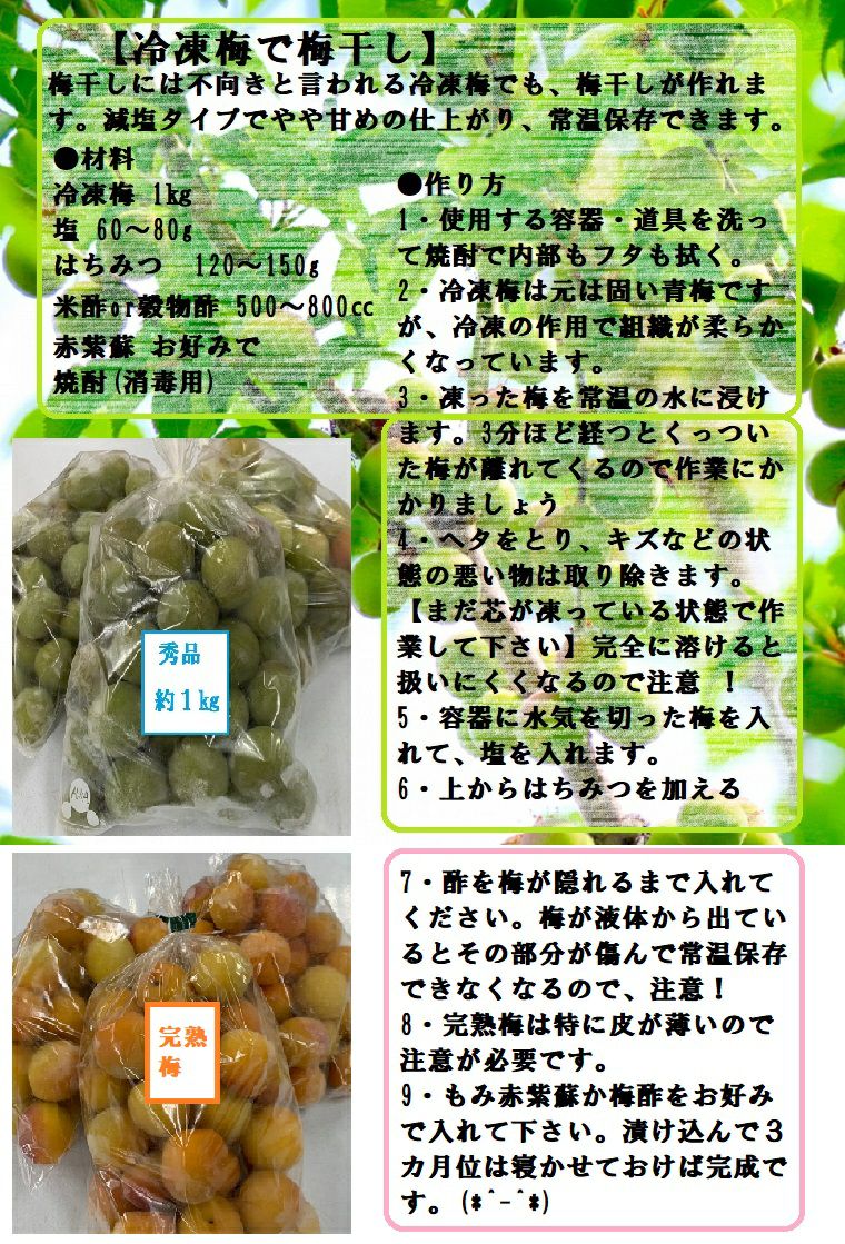 他の画像を見る 押しも押されぬ「梅」の一流ブランド品。 自家製 梅酒用 梅シロップ用に最適!コクのある円やかな味わいに仕上がります。 冷凍梅 秀品約1K袋 国産厳選梅 (南高梅 ・紅さし梅・新平太夫梅・福太夫梅・ 完熟梅・青梅) 送料込み(一部除く) クール便でお届け 当店特別価格 ¥ 3,670 税込 詳細を見る お気に入りに登録する