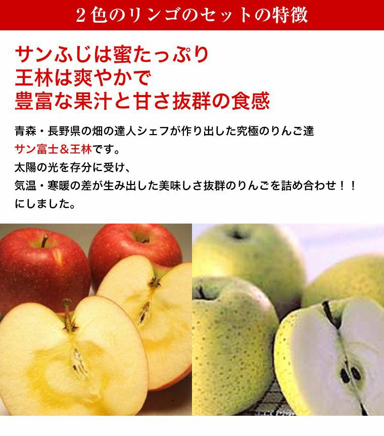 他の画像を見る 贈り物に最適!食べ比べの2種類のりんご! 2色&2種類のりんご 特秀大玉8玉入り化粧箱 ギフトフルーツセット!! 青森・長野産富士リンゴ(サンフジ)(秋映)等赤色&トキ・シナノゴールド・王林りんご等黄色 2種類おまかせ2色りんご詰め合わせセット 特秀大玉8玉化粧箱 送料込み(一部除く) 当店特別価格 ¥ 4,730 税込 販売期間 2025/10/02 0:00 〜 2026/08/02 23:59 詳細を見る お気に入りに登録する