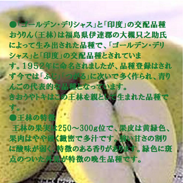 他の画像を見る りんごの貴公子!王林! 緑色に斑点のついた外見が特徴 香りと軽い食感 優しい美味しさが口いっぱいに広がります 青森産りんご 【王林】 特秀大玉8~9玉 11月下旬頃から順次発送 送料込み(一部除く) 当店特別価格 ¥ 3,947 税込 販売期間 2025/11/22 0:00 〜 2026/05/31 23:59 詳細を見る お気に入りに登録する