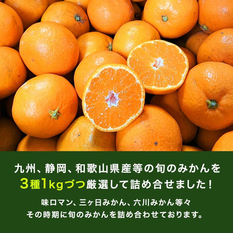 他の画像を見る 産地厳選一押しのみかんを同時期に味比べ!!その時期旬のミカン3種類を1kgづつ3袋計3kg 詰め合わせました。※品種・産地等の指定は出来かねます※ 全国厳選 みかん 3品3kg旬の詰め合わせ お任せ1kgずつ3袋=計3kg 食べ比べ フルーツセット 御歳暮 九州 静岡 愛媛 和歌山 等各地自慢の 詰め合わせ みかん 柑橘 果物 フルーツ 厳選 光センサー選果 温州みかん 送料込み(一部除く) 当店特別価格 ¥ 3,920 税込 販売を終了しました。 詳細を見る お気に入りに登録する
