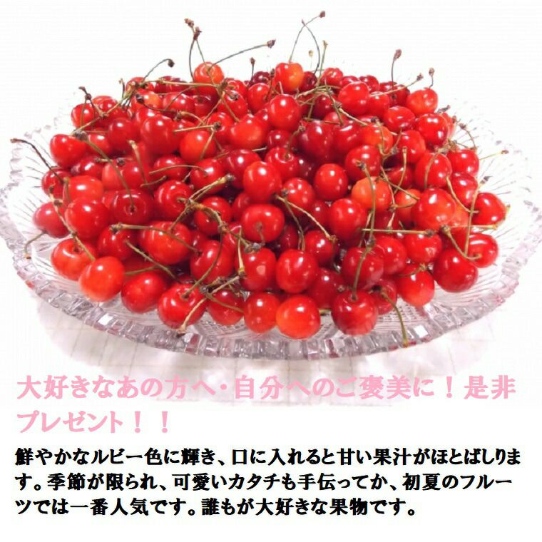 他の画像を見る さくらんぼ王国山形からの贈り物・薄紅色の宝石! 父の日 御祝 プレゼントに!! さくらんぼ 180g×2パック入り 山形県産 *今年は不作の為出荷不可*例年6月下旬より順次発送 送料込み(一部除く) クール便でお届け 当店特別価格 ¥ 3,560 税込 販売を終了しました。 在庫切れ 詳細を見る お気に入りに登録する