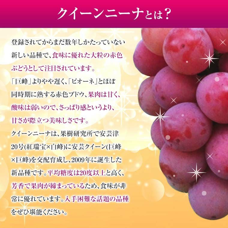他の画像を見る 大注目の赤色ブドウ新品種!濃厚な甘味と豊かな香りは絶品♪ 国産大粒ぶどう【クイ-ンニ-ナ】大2房化粧箱 赤葡萄 山梨・長野県産 現在入荷不安定 送料込み(一部除く) 10%オフ対象商品 クール便でお届け 当店特別価格 ¥ 6,870 税込 販売を終了しました。 在庫切れ 詳細を見る お気に入りに登録する