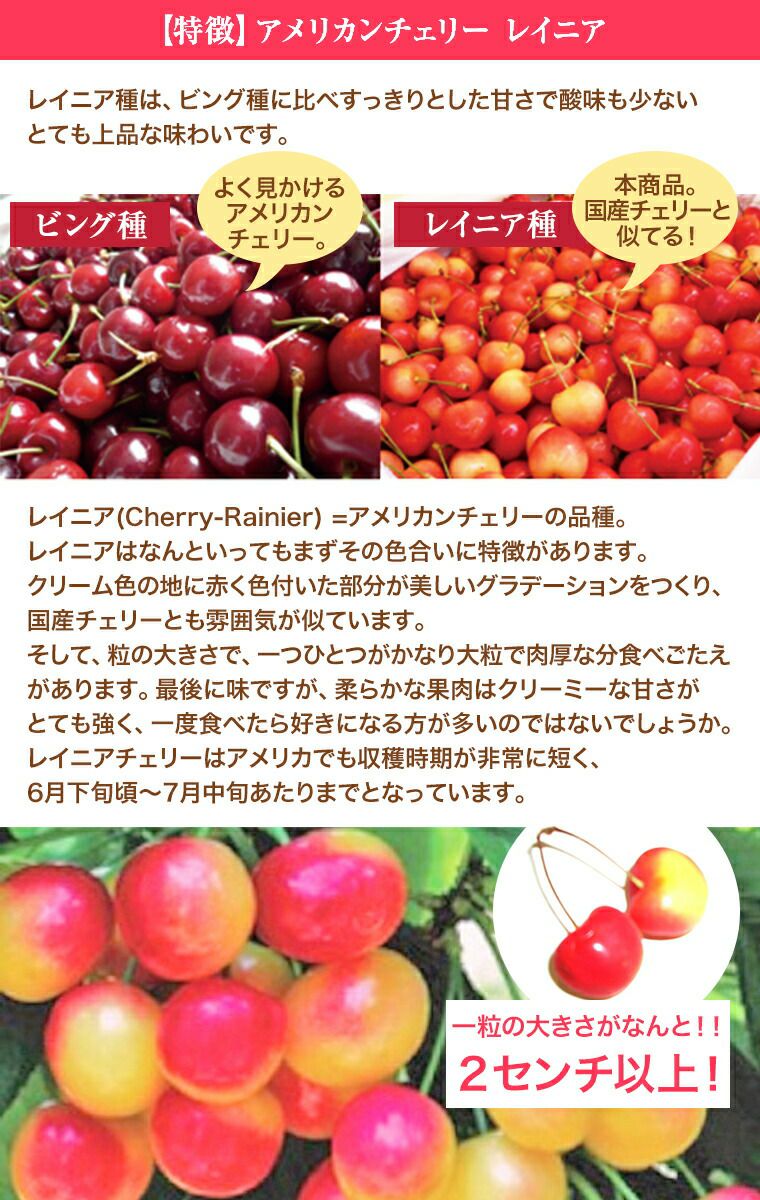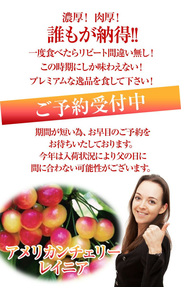他の画像を見る 【とても希少な特選プレミアムチェリー!USAからの限定品!さくらんぼ・薄紅の宝石】 アメリカンチェリー【レイニア】超大粒約1K化粧箱 6月下旬より順次発送 送料込み(一部除く) 10%オフ対象商品 クール便でお届け 当店特別価格 ¥ 10,700 税込 販売を終了しました。 詳細を見る お気に入りに登録する