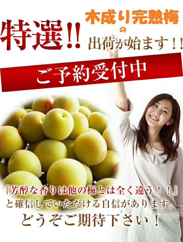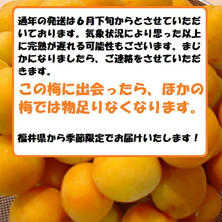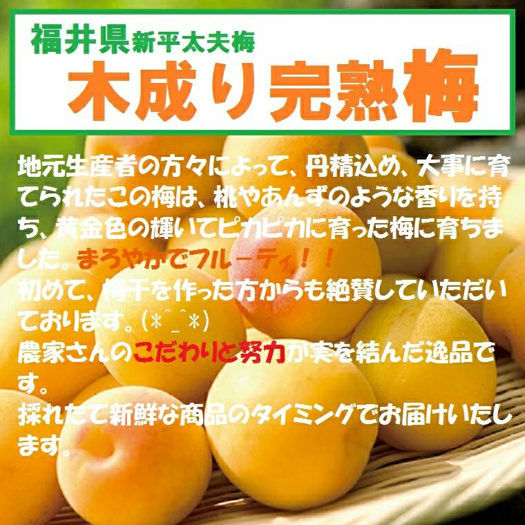 他の画像を見る 黄金色に輝く色合いと香り!芳醇な香りは他の梅とは全く違う!! 福井梅 完熟梅 【新平太夫梅】秀品 約5K箱 サイズ指定なし 6月下旬~7月上旬予約順発送予定 送料込み(一部除く) 10%オフ対象商品 クール便でお届け 当店特別価格 ¥ 8,370 税込 販売を終了しました。 在庫切れ 詳細を見る お気に入りに登録する