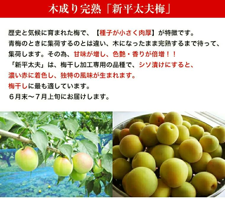 他の画像を見る 黄金色に輝く色合いと香り!芳醇な香りは他の梅とは全く違う!! 福井梅 完熟梅 【新平太夫梅】秀品 約3K箱 サイズ指定なし 6月下旬~7月上旬予約順発送予定 送料込み(一部除く) 10%オフ対象商品 クール便でお届け 当店特別価格 ¥ 5,790 税込 販売を終了しました。 在庫切れ 詳細を見る お気に入りに登録する