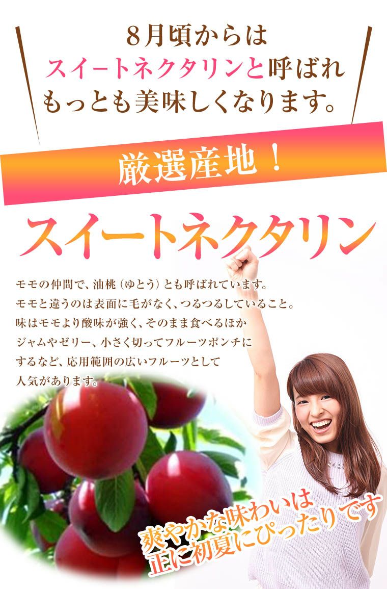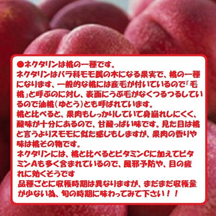 他の画像を見る 【さわやかな酸味が夏にぴったり!】 山梨・長野産【ネクタリン】【スィ-トネクタリン】【ファンタジア】約4K~5K箱 送料込み(一部除く) 10%オフ対象商品 クール便でお届け 当店特別価格 ¥ 8,080 税込 販売を終了しました。 詳細を見る お気に入りに登録する