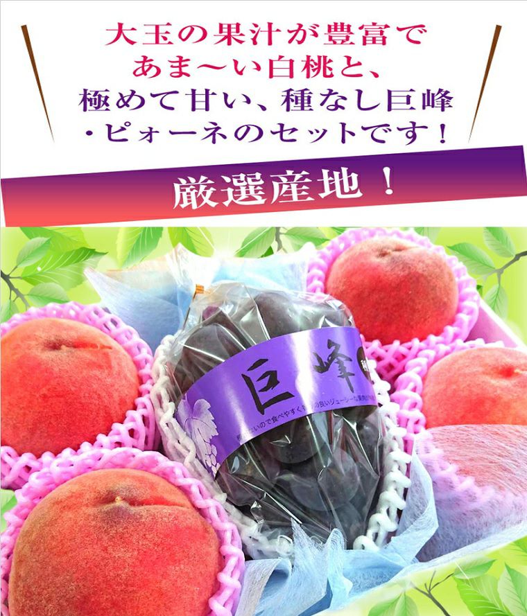 他の画像を見る お盆お供え・お彼岸 お中元・巨峰・ピオ-ネ・ゴルビ-・ナガノパ-プル等旬の王様黒葡萄&白鳳・白桃・黄金桃等 旬の大粒黒葡萄1房+桃大玉4個セット化粧箱 送料込み(一部除く) 10%オフ対象商品 クール便でお届け 当店特別価格 ¥ 6,180 税込 販売を終了しました。 詳細を見る お気に入りに登録する