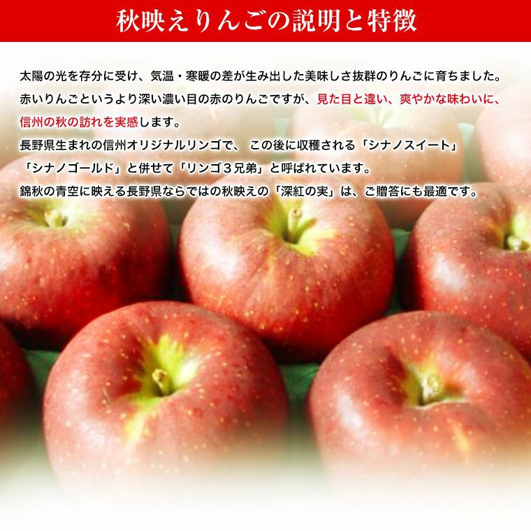 他の画像を見る 太陽と大地の恵み!長野県オリジナル品種! 長野産【秋映え】りんご特秀大玉8玉化粧箱 ご予約順に発送予定 送料込み(一部除く) 当店特別価格 ¥ 4,930 税込 販売を終了しました。 詳細を見る お気に入りに登録する